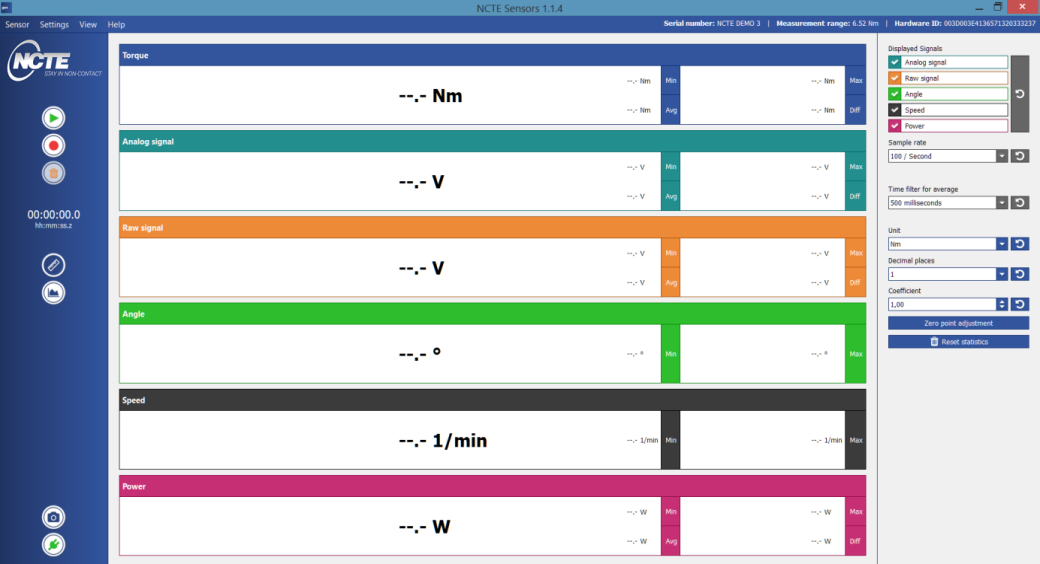 另一方面,我們的軟件由之前的簡易讀取界面升級成多功能采集數(shù)顯界面,包含扭矩,原始電壓,電壓增量,角速度,轉(zhuǎn)速,功率等完整曲線顯示和分析